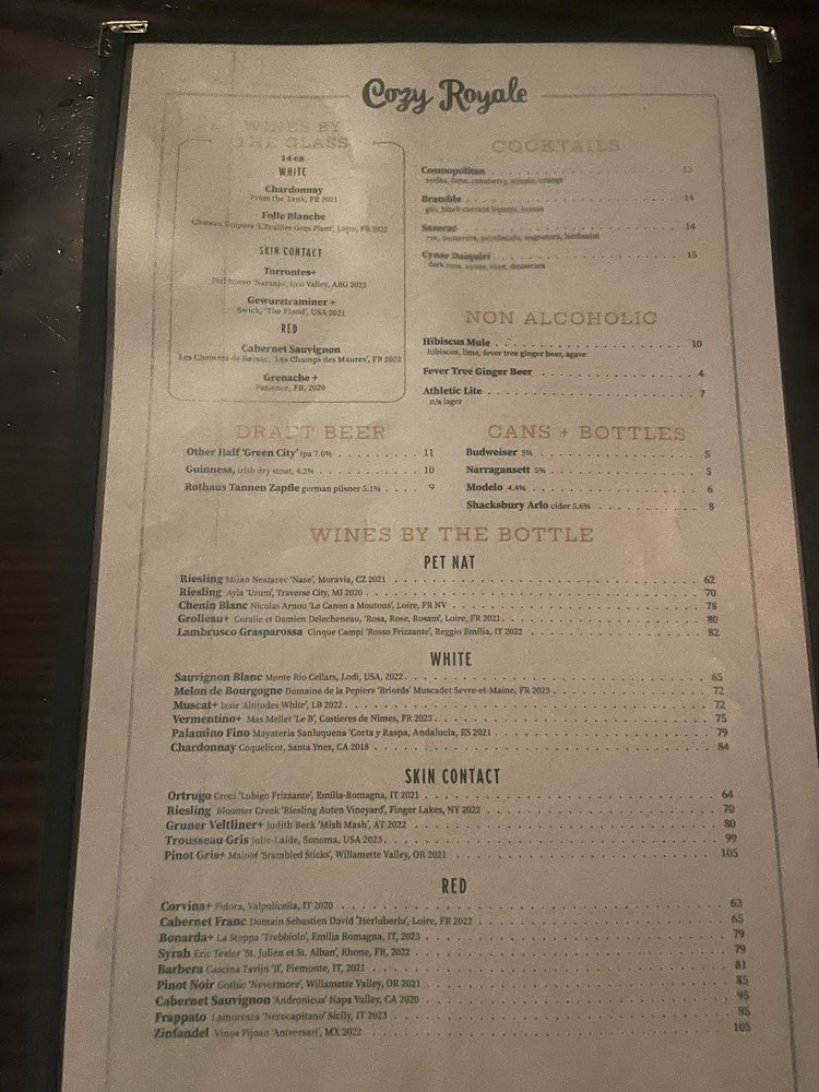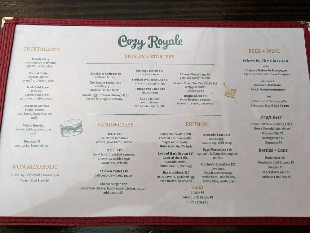 Cozy Royale, located in Brooklyn, NY, is a versatile establishment offering a unique blend of Cocktail Bars, Beer Bar, and Wine Bars. This cozy spot caters to various preferences, from casual to classy, with amenities like outdoor seating, free Wi-Fi, and happy hour specials. Customers rave about the comfort American food, particularly the burgers, chicken and waffles, and classic martinis. The ambiance is described as tavern-like with impeccable service, making it ideal for a casual date or group dinner. Standout menu items include the dry-aged cheeseburger, sticky toffee pudding, and heirloom tomatoes. Whether you're looking for a relaxing evening with great food and drinks or a place to enjoy some good music, Cozy Royale is a must-visit destination in Williamsburg.